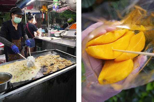 With a rich complex of courtyards, pavilions and patios, the Wat Pho is a purely serene place, calling for meditation. Once our soul relieved it is time to come back to something slightly more prosaic but truly essential: food! Thai people really love to eat, everywhere and at any time. I have rarely seen a country where food abounded in so many kinds of colors, scents and flavours! Besides of temples and museums, one of the pleasure when you visit Bangkok is to stroll into street markets, to eat swiftly a plate of steaming pad thai or massaman curry, then freshen up with perfectly ripe mango or iced fruit smoothie to face the scorching heat of the day... / Avec son complexe ensemble de cours, de pavillons et de patios, le Wat Pho est un lieu d'une grande sérénité, appelant à la méditation. Une fois notre esprit apaisé il est temps de revenir à quelque chose de plus prosaïque et pourtant tellement essentiel: la nourriture! Les Thaïlandais adorent littéralement manger, partout et tout le temps. Rarement j'ai vu une pays où la nourriture abondait avec autant de couleurs, de parfums et de saveurs différents! Car au delà des temples et des musées, le plaisir à Bangkok c'est aussi errer dans ses rues et ses marchés, déguster à la volée un plat de pad thaï ou de curry massaman, puis se rafraîchir avec quelques dés de mangue mûre à souhait ou encore une smoothie glacé pour affronter la chaleur de la mi-journée...