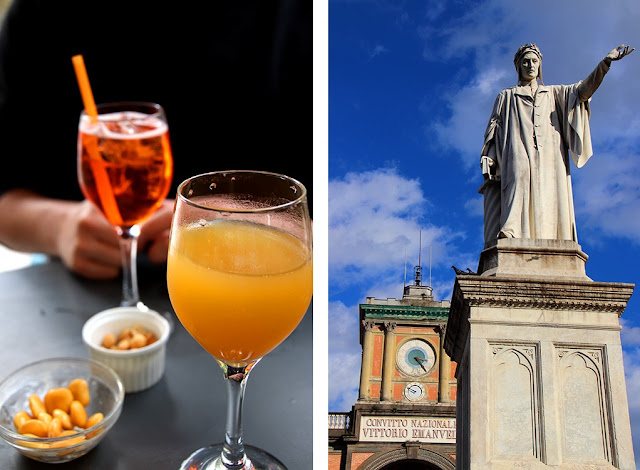 After a long walk why not stroll between Piazza Dante and Piazza Bellini for lunch. Located along Via Toledo, Piazza Dante, of course, has been named to honor the famous Middle Ages poet Dante Alighieri. His statue sculpted in 1871 by Tito Angelini dominates the square. You just have to cross a covered passage to reach Piazza Bellini. Even if it is more modest, this square is also lively and flanked by numerous bars where you can sip spritz for just 2€. Although this cocktail is from Venice, it became popular throughout the Italian peninsula. If gastronomy is not necessarily the primary reason that brings the visitor to Naples, eating is nevertheless an essential activity in this city. The Neapolitan cuisine is one of the most famous in Italy and among all the local specialties that can be tasted here there is of course the real Neapolitan pizza. Because if we of course find pizzas - more or less authentic and appetizing - all over the world, in Naples it is a true religion. A real pizza in southern Italy is a gastronomic experience in itself. The topping - generally simple - is made up of a few tasty ingredients that crown a deliciously soft and squishy dough. In addition to prosciutto, tomato, mozzarella or basil, there are more original garnishes: walnut, squash or artichoke spread, porcini mushrooms, anchovies marinated in lemon and so on. The real buffalo mozzarella or Mozzarella di Bufala Campana is also a specialty of Naples with a PDO. There is an almost unlimited quantity of delicacies each more delicious than the other in Naples, but among the most delightful I could mention the spaghetti alle vongole, garnished with clams and cherry tomatoes or the gnocchi alla sorrentina, topped with a rich tomato sauce with meat and mozzarella. Otherwise try pasta served with sugo alla Genovese, a sauce that comes from Naples and not from Genoa, despite its name and which is made of caramelized pulled meat and onions. For a matter of fact you will notice in Southern Italy that pasta are always very al-dente. There are obviously dozens of recipes fish, squid and assorted seafood, fried or grilled. We will not forget the succulent street food snacks such as frittatine di pasta or macaroni croquettes as well as the arancini or breaded rice balls, that are just as delicious. And finally, gourmets in a hurry can eat on the go a napoletani panini, a rolled brioche garnished with cheese and Neapolitan salami. To die for! / Après une longue marche pourquoi ne pas flâner entre la Piazza Dante et la Piazza Bellini pour se restaurer. Située le long de la Via Toledo, la Piazza Dante fait bien sûr honneur au grand poète médiéval Dante Alighieri dont la statue sculptée en 1871 par Tito Angelini domine la place. Il suffit de traverser un passage couvert pour rejoindre la Piazza Bellini, plus modeste, bien que flanquée de nombreux bars où l'on peut siroter des spritz pour à peine 2€. Bien que d'origine vénitienne, ce cocktail connaît un engouement dans toute la péninsule italienne. Si la gastronomie n'est pas forcément la raison première qui amène le visiteur à Naples, manger est pourtant une activité essentielle dans cette ville. La cuisine napolitaine est l'une des plus célèbres d'Italie et parmi toutes les spécialités locales que l'on peut déguster ici on retrouve bien sûr la véritable pizza napolitaine. Car si l'on mange des pizzas - plus ou moins authentiques et appétissantes - aux quatre coins du monde, à Naples c'est une véritable religion. Une vraie pizza dans le sud de l'Italie est une expérience gastronomique à elle seule. La garniture souvent simple est composée de quelques ingrédients savoureux qui viennent couronner une pâte délicieusement moelleuse et élastique. En plus du jambon cru, de la tomate, de la mozzarella ou encore du basilic on retrouve des garniture plus originales: crème de noix, de courge ou d'artichaut, cèpes, anchois marinés au citron, etc. La mozzarella au lait de bufflonne ou Mozzarella di Bufala Campana est d'ailleurs une spécialité de Naples bénéficiant d'une AOP. Il existe une quantité quasiment illimitée de spécialités plus succulentes les unes que les autres à Naples, mais parmi les plus délicieuses je pourrais citer les spaghetti alle vongole, garnies de palourdes et de tomates cerises ou encore les gnocchi alla sorrentina, nappés d'une riche sauce tomate à la viande et à la mozzarella. Sinon optez pour les pâtes accompagnées de sugo alla Genovese, une sauce qui vient bien de Naples et non de Gènes, malgré son nom, et qui se compose de viande fondante effilochée et d'oignons confits. Vous noterez d'ailleurs que dans le sud de l'Italie, les pâtes sont servies très al-dente. Il existe évidemment des dizaines de recettes de poissons, de calmars et autres fruits de mer frits ou grillés. On n'oubliera les succulents en-cas de la street food napolitaine comme les frittatine di pasta ou croquettes de macaroni ainsi que les arancini, des boulettes de riz panées, tout aussi délicieuses. Et pour finir les gourmands trop pressés pourront manger sur le pouce un panini napoletani, une brioche roulée garnie de fromage et de salami napolitain, à tomber!