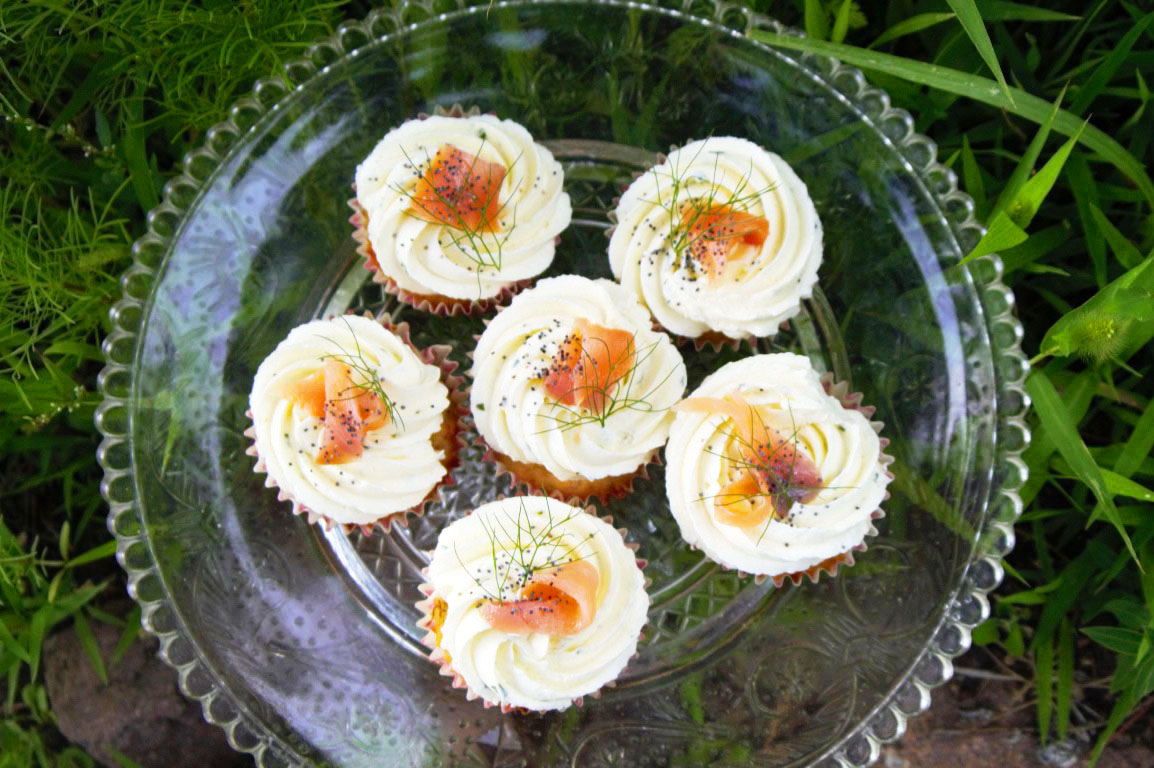 1 - Combine 80 g smoked salmon (chopped), flour, baking powder, dill, salt and pepper. In another bowl cream butter with egg, milk and olive oil. Mix the two preparations. Line cupcakes/muffin tins with baking paper and pour the batter. Put in a preheated oven at 180°C (350°F) for 20 minutes. Let cool.